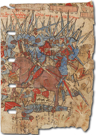 C.2.3. Tristán de Leonís (ms. 22644/1-51, BNE [olim, 226441/1-51]). 59 folios a dos columnas, 28x22 cm. Cincuenta y nueve fragmentos y otros restos con frecuente pérdida de texto. Incluye 26 miniaturas de gran formato y letras capitulares y títulos en rojo. Se encuentra deteriorado con desgarros, hojas mutiladas, galerías de insectos y manchas de humedad. Su contenido es relacionable con el testimonio C.2.2.; el texto está cercano al del impreso de 1501.